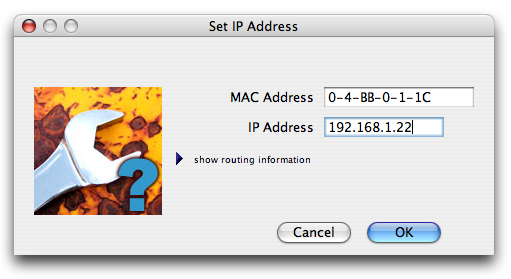To set the IP address of a device, you must know its Serial Number (MAC address) which is printed on its label. Choose 'Set Device IP Address...' from the 'Administrate' submenu of the 'File' menu.