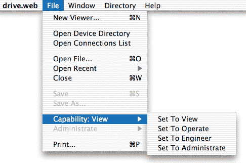 The current capability is shown in the 'File' menu and may be changed from there; a password is required to increase the capability.