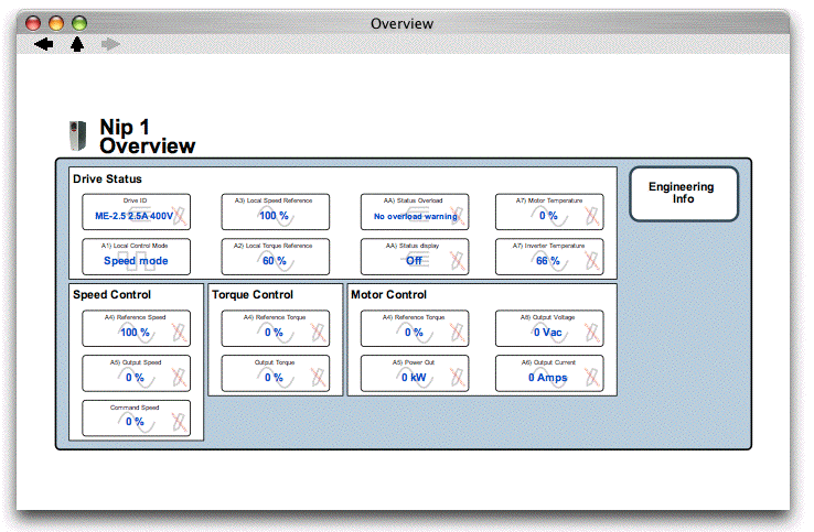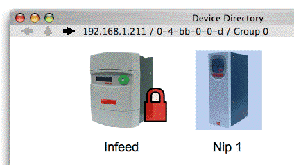 As you move the mouse over a device, the status bar at the top of the window provides information on the IP address, MAC address and group number of the device - e.g. below, the E-series AC Drive named "Nip 1" has an IP address of 192.168.1.211, a MAC address of 0-4-bb-0-0-d, and is in Group 0.