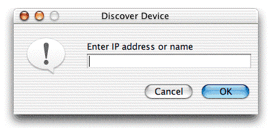 Individual devices may be discovered by selecting the 'Discover Device...' menu item. Enter the device's IP address into the dialog box (you can also enter a name if DNS service is available and the device has a DNS entry).