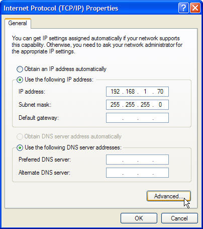 Then, select Internet Protocol (TCP/IP) item in the list. Click on the Properties button. Select the Use the following IP address: button, then set the IP address: and Subnet mask: to 192.168.1.70 and 255.255.255.0, respectively. Finally, click the OK button.
